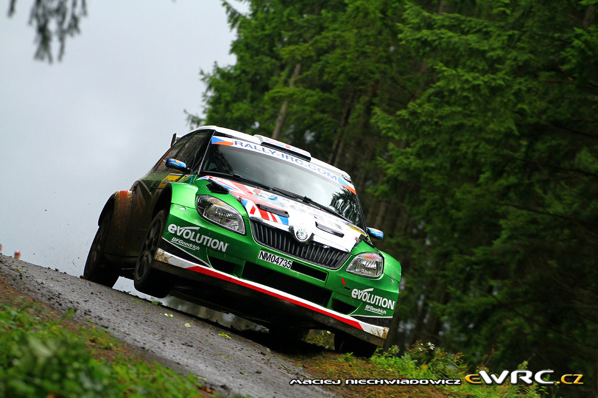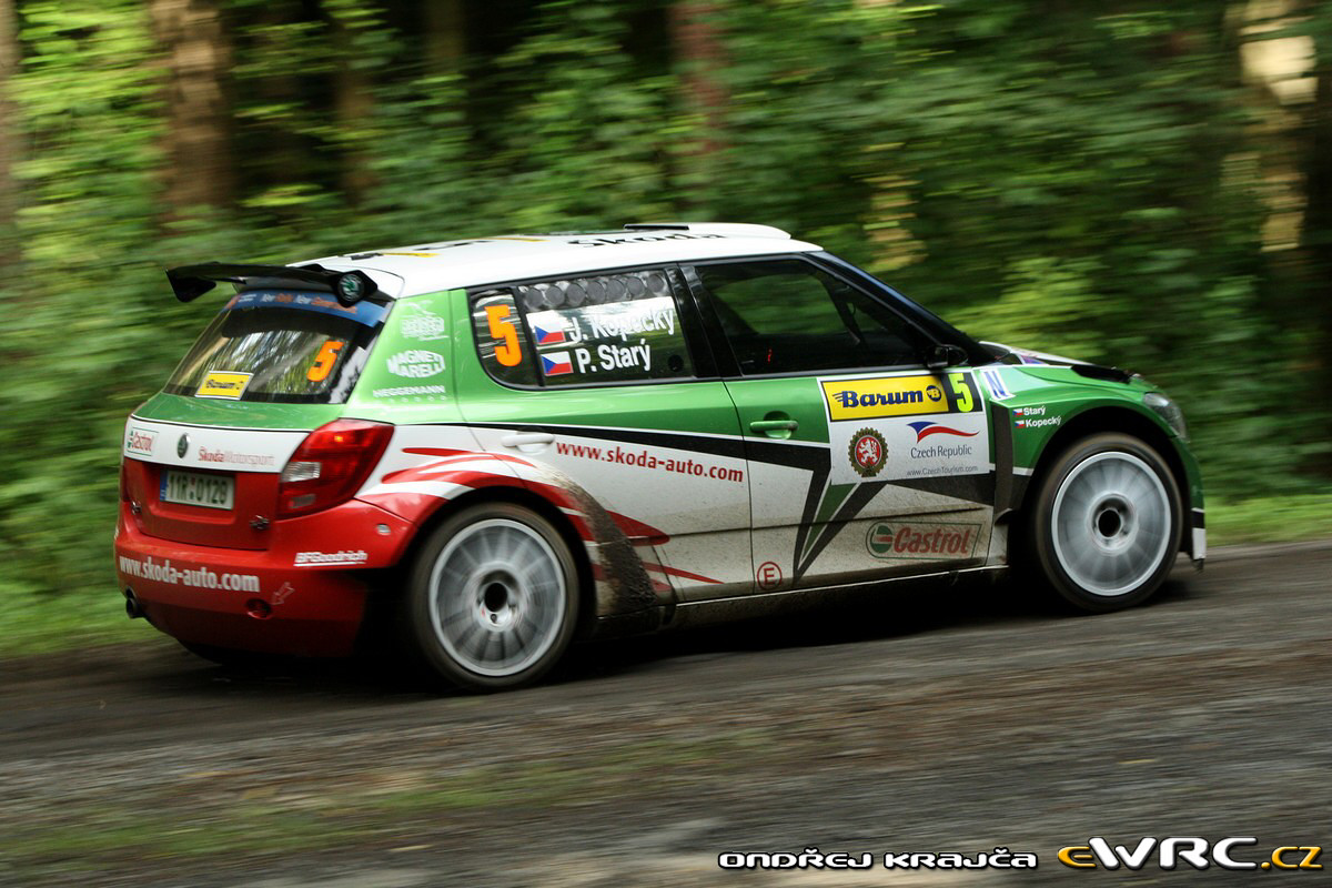 Ας τα πάρουμε με την σειρά όμως. Το πλήρωμα που θεωρείτω το δυνατό φαβορί για τον αγώνα ήταν οι Kopecky-Stary με το επίσης εργοστασιακό Skoda Fabia S2000. Και φυσικά τίμησαν τον τίτλο αυτό καθώς εξ αρχής τέθηκαν επικεφαλής και όλα έδειχναν ότι πάνε για την νίκη στον τοπικό τους αγώνα. Ήταν το ταχύτερο πλήρωμα του αγώνα αλλά όλα αυτά μέχρι την 14η ε.δ.. Εκεί, και ενώ ήταν μπροστά με διαφορά 26'' σχεδόν, είχαν έξοδο με αρκετά χλμ στο κοντέρ που τους ανάγκασε να εγκαταλείψουν τον αγώνα ευτυχώς χωρίς τον παραμικρό τραυματισμό. Η εγκατάλειψη αυτή δείχνει ότι "ρίχνει" σημαντικά τις ελπίδες των Τσέχων για τον φετινό τίτλο καθώς είδαν τους αντιπάλους τους να αυξάνουν την διαφορά τους στην βαθμολογία ενώ επίσης έχασαν σημαντική ευκαιρία να βρεθούν και στην διεκδίκηση του τίτλου του ERC καθώς μια νίκη θα ψαλίδιζε σημαντικά και εκεί την διαφορά τους από την κορυφή της βαθμολογίας.
