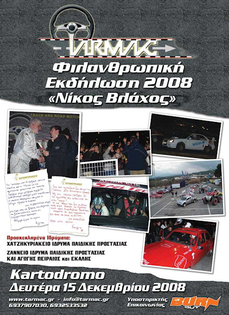 Η ΛΕ.Μ.ΑΘ. ΠΑΡΑΛΛΗΛΟΔΡΟΜΙΟ μετά από έγκριση της ΕΘ.Ε.Α. διοργανώνει την Κυριακή 14 Δεκεμβρίου 2008 στις 10:00, φιλικό αγώνα time trial στη χωμάτινη πίστα «Παραλληλοδρόμιο», στο Σπαθοβούνι Κορινθίας. Ο αγώνας θα είναι συνολικού μήκους 6,4 χλμ., (4 γύροι των 1600 μέτρων), σε ένα σκέλος. Δεκτά γίνονται αυτοκίνητα των κατηγοριών: Ν, Α, Ε, Ιστορικά, Εμπορίου, φόρμουλα για χώμα, τύπου «τζιπ» 4x4. |