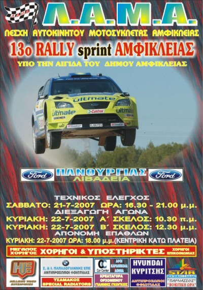 Η Αγωνιστική Λέσχη Αυτοκινήτου Καρδίτσας (ΑΛΑΜΑΠ) μετά από έγκριση της Εθνικής Επιτροπής αγώνων και άδεια του Υπουργείου Δημοσίας Τάξεως διοργανώνει το Σαββατοκύριακο 25 & 26 Αυγούστου 2007 το 32ο RALLY SPRINT ΑΣΦΑΛΤΙΝΟ Ν.ΠΛΑΣΤΗΡΑ, μετά από την παρότρυνση πολλών φίλων αγωνιζομένων και την επιτυχημένη διοργάνωση του 2005 στο Μεσενικόλα με 86! συμμετοχές που αποτελεί ρεκόρ μέχρι και σήμερα. |
