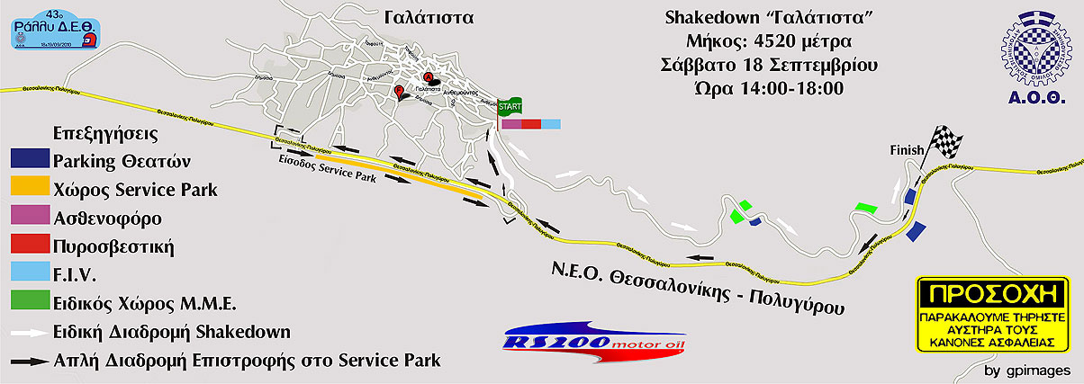 Έχει προβλεφθεί χώρος για τα service των ομάδων αλλά και πολλές θέσεις παρκινγκ για θεατές και Μ.Μ.Ε., πολύ κοντά στην ειδική, επιτρέποντας την προσέλευση καθ’ όλη την διάρκεια του Shakedown. Οι κανονισμοί που διέπουν το Shakedown είναι αυτοί που ισχύουν και για την ημέρα του αγώνα έτσι η πρόσβαση για όσους επιθυμούν να «κλειστούν» στη ειδική με το αυτοκίνητο τους, θα επιτρέπεται 90 λεπτά για τους θεατές και . 60 λεπτά για τα Μ.Μ.Ε, πριν την εκκίνηση του πρώτου αγωνιστικού. Στην ιστοσελίδα του Α.Ο.Θ. www.aoth.gr μπορείτε να βρείτε τον αναλυτικό χάρτη του Shakedown. |