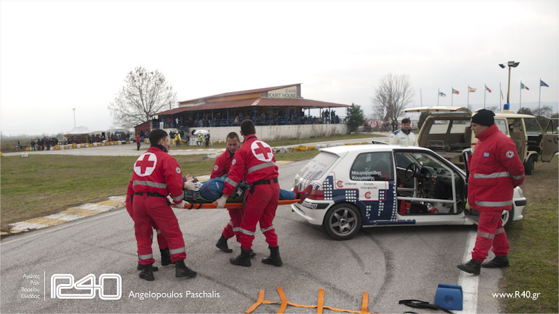 Στη συνέχεια είχαμε ένα εικονικό ατύχημα μέσα στην ειδική και όπως θα περιμέναμε, η οργάνωση διέκοψε την "ειδική" για να επέμβει ασθενοφόρο. Οι Σαμαρίτες του Ερυθρού Σταυρού που έχουν επανδρώσει πολλές φορές τις ειδικές σε πραγματικούς αγώνες έκαναν μια πραγματική επίδειξη του τρόπου επέμβασης, ασφάλισης και μεταφοράς ενός τραυματία μέσα από αγωνιστικό αυτοκίνητο μέχρι το ασθενοφόρο.
