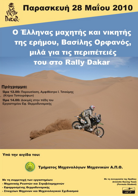 Μετά από πρόσκληση του επικ. καθηγητή του Τμήματος Μηχ. Μηχανικών κ. Ανέστη Κάλφα παρών στην εκδήλωση και κεντρικός ομιλητής θα είναι ο αναβάτης κ. Βασίλης Ορφανός, που έχει λάβει μέρος πέντε φορές στο δυσκολότερο αγώνα του μηχανοκίνητου αθλητισμού παγκοσμίως, το Rally Dakar, πετυχαίνοντας μάλιστα μέχρι και νίκη στην κατηγορία 400cc το 2003.