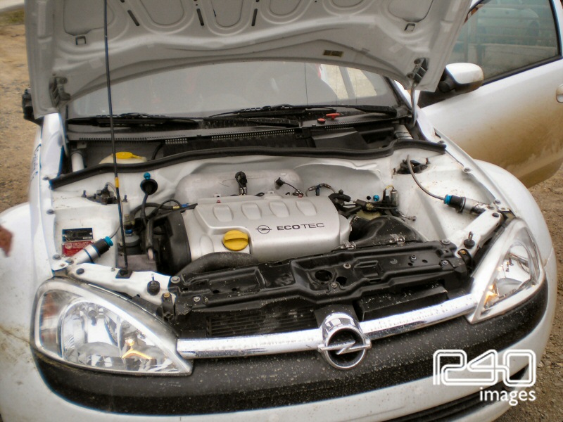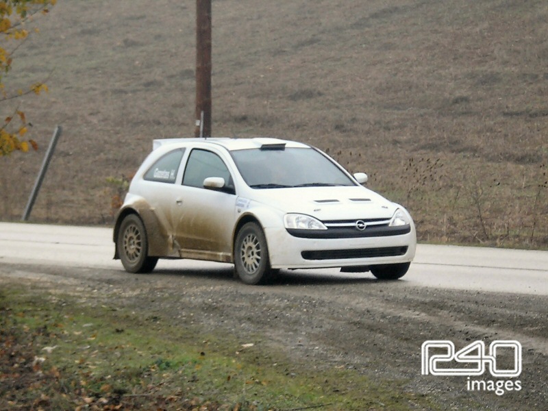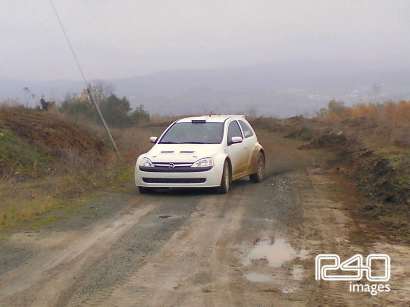 Έχοντας όλα αυτά στο μυαλό μας φτάνουμε στο προκαθορισμένο μέρος που θα λάμβανε χώρα το τεστ λίγο έξω από το χωριό της Ανάβρας. Εκεί βρίσκεται ήδη το αυτοκίνητο με το πλήρωμα και τους μηχανικούς. Και χωρίς να το καταλάβουμε, βρισκόμαστε στο δεξί μπάκετ έτοιμοι για τις πρώτες αναγνωριστικές «βόλτες» με τον Μπάμπη. Πολύ γρήγορο το κομμάτι, σε πανέμορφη τοποθεσία ακριβώς δίπλα στη λίμνη. Δενόμαστε και ξεκινάμε. Από τα πρώτα μέτρα βλέποντας τον Μπάμπη πίσω από το τιμόνι καταλαβαίνεις ότι πρόκειται για έναν έμπειρο οδηγό που γνωρίζει πολύ καλά τι κάνει, εμπνέοντας εμπιστοσύνη αμέσως. Και ενώ σηζητάμε μέσα στο αμάξι και μου λέει τις πρώτες του εντυπώσεις, ο ρυθμός ξαφνικά αρχίζει να ανεβαίνει και εκεί αρχίζουμε να βλέπουμε τις δυνατότητες του αυτοκινήτου. Η ανάρτηση καταπίνει τα πάντα. Πέρασμα με το πέρασμα πηγαίνουμε όλο και πιο γρήγορα. Ο κινητήτηρας μετά τις 7000 στροφές κυριολεκτικά σε κάνει να ανατριχιάζεις και με την απόδοση του και με τον ήχο του. Το αυτοκίνητο αρχίζει να παίρνει εντυπωσιακές γωνίες και όλα αυτά να ελέγχονται από τον οδηγό με καταπληκτική άνεση με ήρεμες και σίγουρες κινήσεις στο τιμόνι. Επιστροφή και μικρό διάλειμα για να αλλαχτούν οι ρυθμίσεις στην ανάρτηση καθώς το εμπρός μέρος του φάνηκε λίγο σκληρό. Εκεί συνεχίζεται η συζήτηση και ο Μπάμπης μεταξύ άλλων μας εκμυστηρεύεται ότι το αυτοκινητο εκείνη τη στιγμή είχε τις ρυθμίσεις στην ανάρτηση που χρησιμοποίησε ο Kris Meeke στο Ακρόπολις του 2003. Κάπου εκεί μετά τις εντυπωσιακές βόλτες που κάναμε, παίρνουμε ξανά το ρόλο του θεατή και στο δεξί μπάκετ μπαίνει ο συνοδηγός του πληρώματος, Γιώργος Φασκιώτης. Αμέσως καταλαβαίνεις ότι εκεί αρχίζουν να σοβαρεύουν τα πράγματα.. Παρακολουθώντας τα περάσματα βλέπουμε το πλήρωμα να ανεβάζει κι άλλο το ρυθμό και να εξοικειώνονται όλο και περισσότερο με το Corsa. Αρκετά τα περάσματα που πραγματοποίησε ο οδηγός καθώς μετά πήραν σειρά στο δεξί μπάκετ αρκετοί φίλοι και φυσικά όλοι εντυπωσιάστηκαν από την εμπειρία τους.
