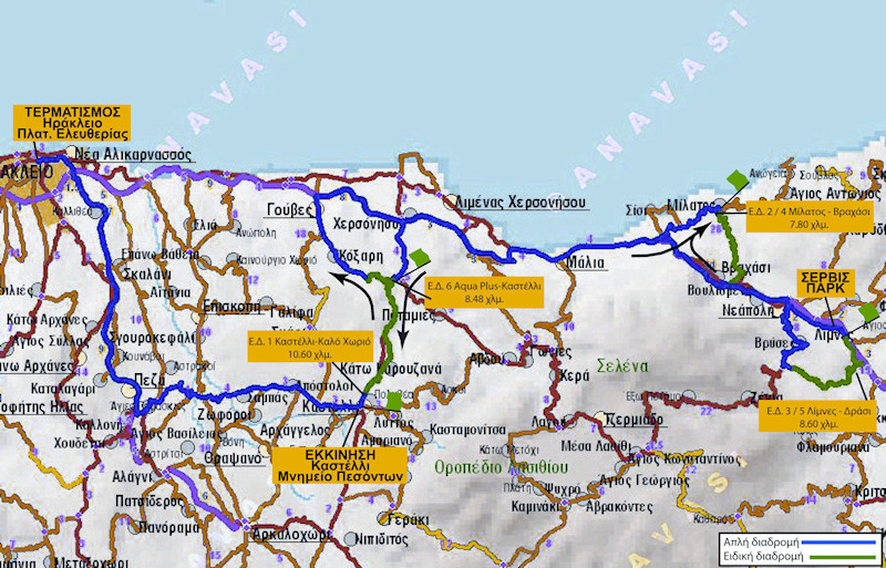 ΠΡΟΣΒΑΣΗ 1 Μετά το Aqua Plus συναντάτε την διασταύρωση προς Καστέλι. Μηδενίζετε το κοντέρ και μετά από 1400μ. φτάνετε στο 7.79χλμ της ειδικής διαδρομής.