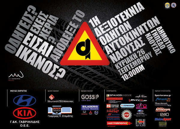 Η «Λέσχη Αυτοκινήτου Νάουσας – Naoussa Racing Club» διοργανώνει για πρώτη της χρονιά την 1η Δεξιοτεχνία Νάουσας, η οποία προσμετρά στο Κύπελλο Δεξιοτεχνιών Βορείου Ελλάδος. Η δεξιοτεχνία θα διεξαχθεί την Κυριακή 26 Σεπτεμβρίου 2010 στον εξωτερικό χώρο του Δημοτικού Γηπέδου Νάουσας. Δικαίωμα συμμετοχής έχουν όλα τα Ι.Χ. αυτοκίνητα και φορτηγάκια με την υποχρέωση ο οδηγός να είναι κάτοχος διπλώματος οδήγησης , να έχει κράνος και πυροσβεστήρα και να είναι άνω των 18 ετών, όπως και προαιρετική αγωνιστική άδεια ετήσιας διάρκειας (license). |