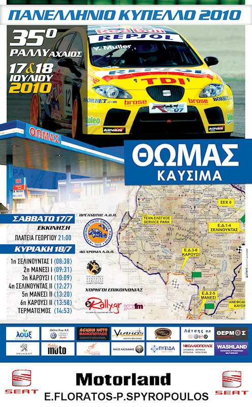 Το Σάββατο και την Κυριακή 17-18 Ιουλίου 2010 Ο Α.Ο.Π. διοργανώνει τον αγώνα του Πανελληνίου Κυπέλλου Ασφάλτου "35ο Ράλλυ Αχαιός" στην ευρύτερη περιοχή του νομού Αχαϊας. Το 35ο Ράλλυ Αχαιός περιλαμβάνει 3 ειδικές διαδρομές επαναλαμβανόμενες, service park και σταθμό ανασυγκρότησης, με σκοπό να γίνει ένας συγκροτημένος και ενδιαφέρον αγώνας. |