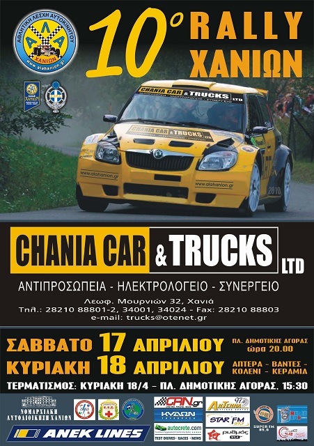 | Το Δ.Σ. και τα μέλη της Αθλητικής Λέσχης Αυτοκινήτου Χανίων έχουν τη χαρά να σας προσκαλέσουν να παρακολουθήσετε το 10ο Rally Χανίων, ένα αγώνα που θα εξελιχθεί στα πανέμορφα βουνά του Νομού Χανίων στις 17 & 18 Απριλίου 2010. Παράλληλα ανακοινώνει πως για όσους θέλουν να βρεθούν στα Χανιά για την παρακολούθηση του 10ου Rally Χανίων, έχει εξασφαλίσει προνομιακή τιμή σε δίκλινο δωμάτιο. Η έκπτωση ισχύει στο ξενοδοχείο που θα φιλοξενήσει τα πληρώματα του αγώνα και είναι το Creta palm στον κάτω Σταλό. |