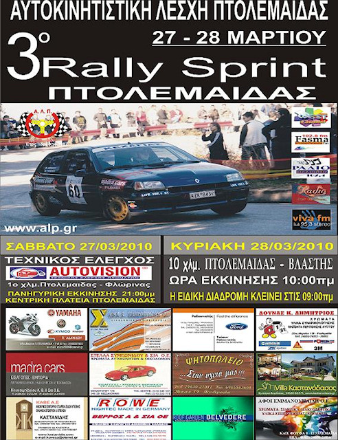 Με επιτυχία ολοκληρώθηκε το 3ο Rally Sprint Πτολεμαίδας, που αποτέλεσε τον 1ο γύρο του Κυπέλλου Ράλλυ Β.Ελλάδος. Τον καλύτερο συνολικό χρόνο, πέτυχαν οι Μπατσάρας Jnr-Μπατσάρα Αι. με το γνωστό Mitsubishi Lancer RS Evolution III, στην αναδιαμφησβήτητα καλύτερη ως τώρα εμφάνιση τους στους αγώνες. Παρά την λάθος επιλογή ελαστικών στο 1ο πέρασμα έγραψαν έναν πολύ καλό χρόνο ενώ στο 2ο τον βελτίωσαν ακόμα περισσότερο με αποτέλεσμα να πάρουν τη νίκη στην κατηγορία των 2000+, αλλά και στην άτυπη γενική, στην οποία μάλιστα επικράτησαν για λιγότερο από δέκατο του δευτερολέπτου!