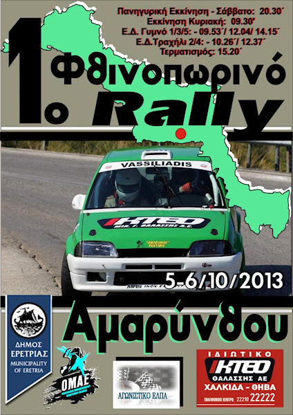 To «37ο ΡΑΛΛΥ ΑΧΑΙΟΣ» που διοργανώνει ο Α. Ο. Π. το Σάββατο και την Κυριακή 12-13 Oκτωβρίου 2013 θα διεξαχθεί στα όρια του Ν. Αχαΐας και περιλαμβάνει 3 ειδικές διαδρομές επαναλαμβανόμενες. Τα αυτοκίνητα αφού πραγματοποιήσουν την Super Ειδική στο ΒΙΟ.ΠΑ. Γλαύκου θα γυρίσουν για ανασυγκρότηση και διανυκτέρευση στο κολυμβητήριο Α.ΠΕΠΑΝΟΣ. Την επόμενη 13 Οκτωβρίου 2013 τα αυτοκίνητα αφού διανύσουν 80χλμ ειδικών διαδρομών στις γνωστές ειδικές Κομπηγάδι και Φτέρη θα ξανακάνουν Super Ειδική στο ΒΙΟ.ΠΑ. και θα πάνε για τερματισμό. |