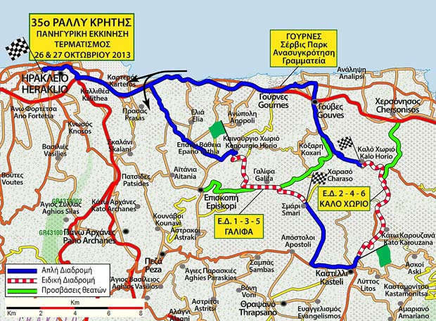 Την Κυριακή το κέντρο του αγώνα, γραμματεία και service park, θα είναι στο πρώην Δημαρχείο Γουβών, στο χώρο της παλιάς Αμερικάνικης Βάσης στις Γούρνες. Ο τερματισμός θα πραγματοποιηθεί στην Πλατεία Ελευθερίας στο Ηράκλειο, στις 16:20 το απόγευμα.