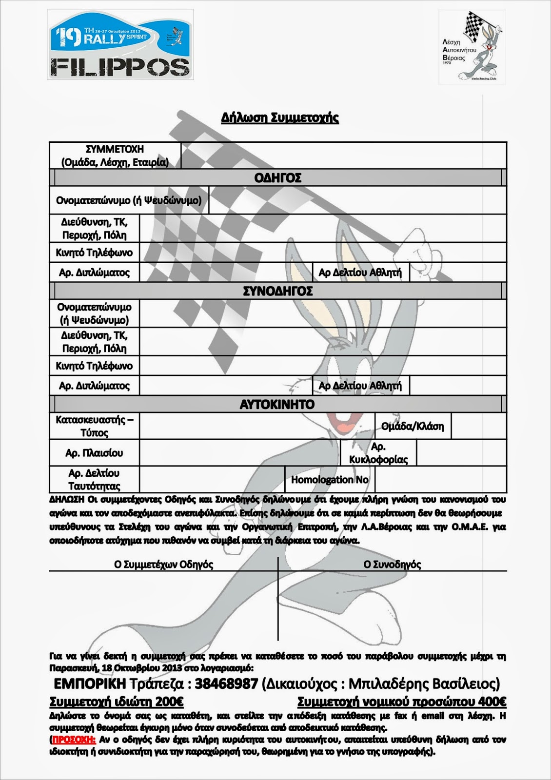 Για να γίνει δεκτή η δήλωση συμμετοχής θα πρέπει να συνοδεύεται με κατάθεση του ποσού του παραβόλου συμμετοχής μέχρι την Παρασκευή 18 Οκτωβρίου 2013 και ώρα 22:00 στον λογαριασμό : ΕΜΠΟΡΙΚΗ Τράπεζα : 38468987 (Μπιλαδέρης Βασίλειος)