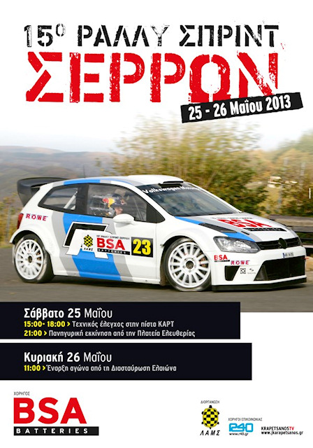 Η Λέσχη Αυτοκινήτου και Μοτοσικλέτας Σερρών (Λ.Α.Μ.Σ.) διοργανώνει στις 25-26/05/2013 το 15ο Ράλλυ Σπριντ Σερρών.
